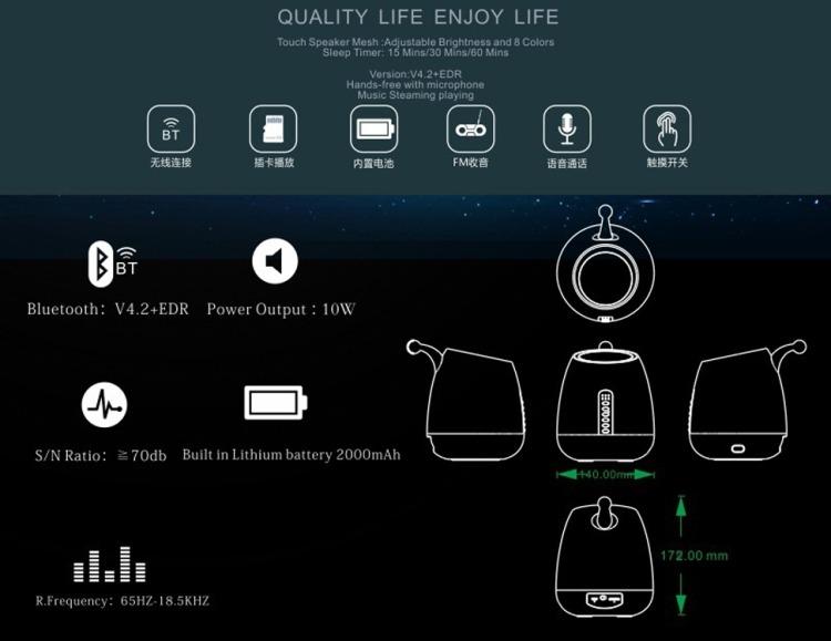 MUSKY DY50 Portable Wireless Bluetooth Subwoofer Speaker Night LightProduct DescriptionMUSKY DY50 Portable Wireless Bluetooth Subwoofer Speaker Night LightBluetooth 4.2 connection, widely compatible with smartphones and tablets10W power and built-in 1 speaker deliver fantastic soundBuilt-in microphone for hands-free calling/answeringSupport playing music from TF card / FM play / AuxAir duct design for noise reductionSleep timer: 15 min/30 min/60 minNightlight with touch controller for adjustable brightnessBuilt-in rechargeable 2000mAh lithium ion batterySpecification:Bluetooth version: V4.2+EDRFrequency range: 65Hz-18.5KHzSNR: ≥70dBOutput: 10WSpeaker: 4Ω; 66mmCharging port: Micro USB 5V/1ABattery capacity: 2000mAhCompatible with:iPhone Samsung Huawei Sony etc. Bluetooth-enabled smartphonesPackage included:1 x MUSKY DY50 Portable Wireless Bluetooth Subwoofer Speaker Night Light1 x Charging Cable1 x Aux Cable1 x English & Chinese User ManualAccessory only, other items not includedSpecification:General Certificate CE , ROHSPackage Weight One Package Weight 1.00kgs / 2.21lbQty per Carton 20Carton Weight 19.00kgs / 41.89lbCarton Size 59cm * 53cm * 39cm / 23.23inch * 20.87inch * 15.35inch