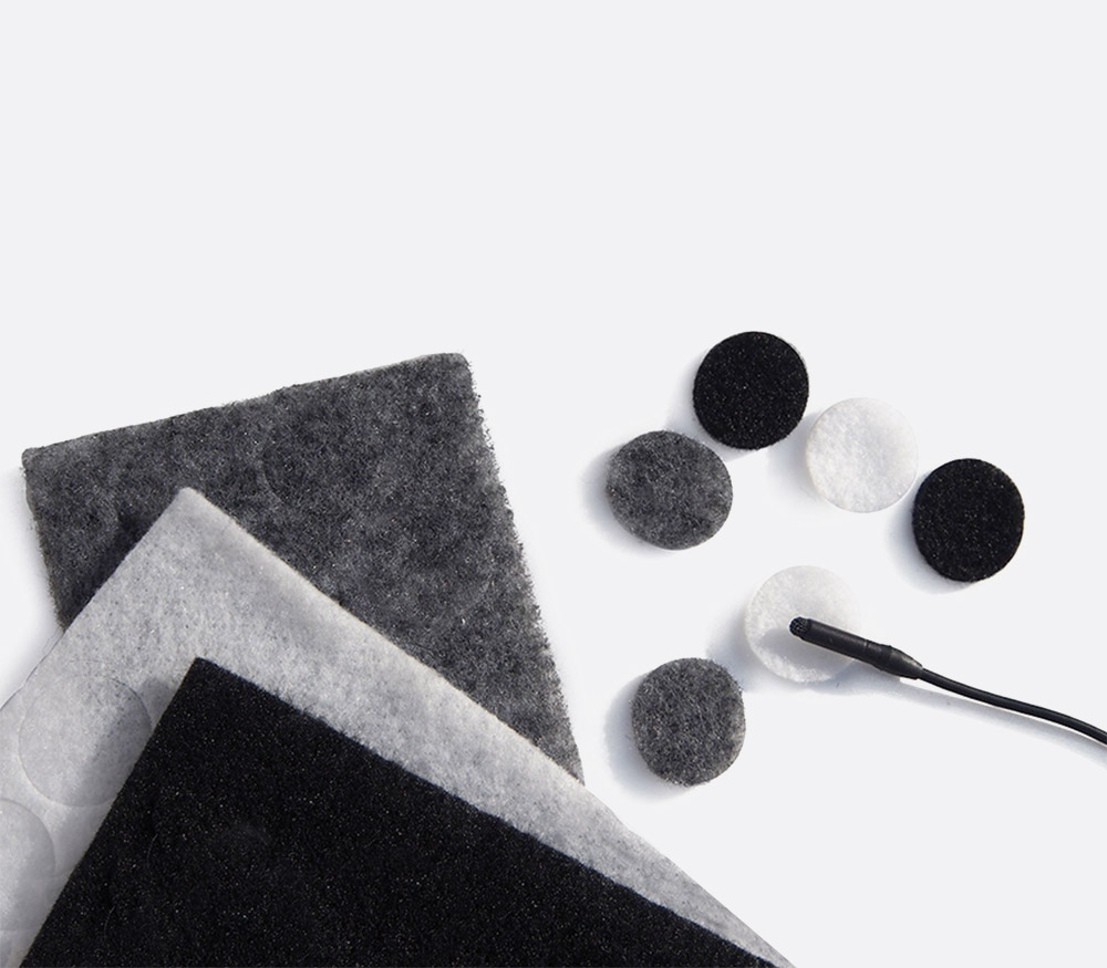 Using Stickies to affix the microphone, a soft fabric disc is then added on top to minimise the sounds of clothing rustle and low wind noise.