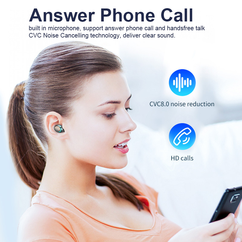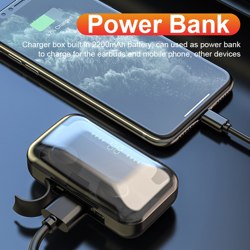 6). Earbuds built in 50mAh battery, playback time is about 4 ~5 hours, Charger Box built in 2200mAh, can used as power bank to charge the earbuds and other devices such as mobile phones, etc.