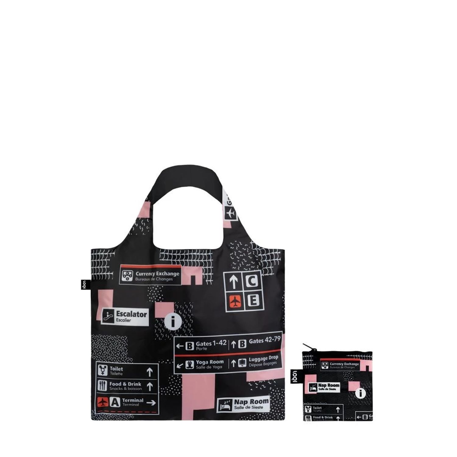An array of airplanes already airborne. A final call for a flight to Vancouver. Beijing is just beginning to board. From New York to Berlin. Rome to Beijing. Where are we going next? Simply choose your destination and off we go. It's up, up and away with the Airport tote bag!