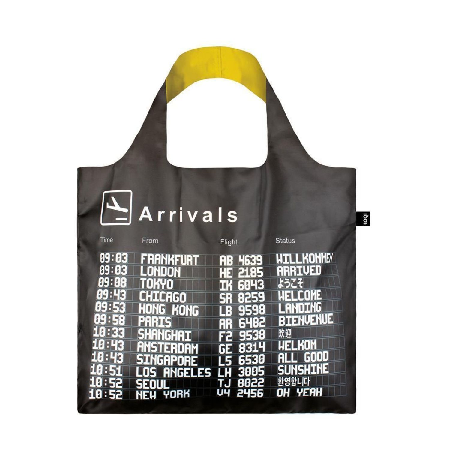 An array of airplanes already airborne. A final call for a flight to Vancouver. Beijing is just beginning to board. From New York to Berlin. Rome to Beijing. Where are we going next? Simply choose your destination and off we go. It's up, up and away with the Airport tote bag!