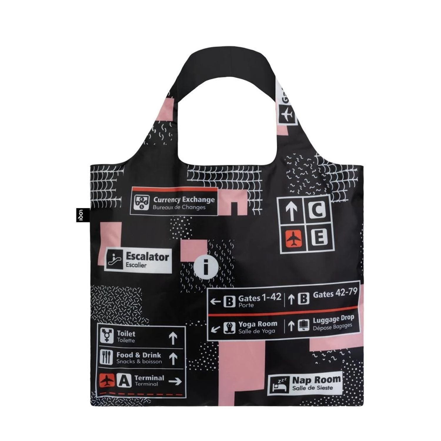 An array of airplanes already airborne. A final call for a flight to Vancouver. Beijing is just beginning to board. From New York to Berlin. Rome to Beijing. Where are we going next? Simply choose your destination and off we go. It's up, up and away with the Airport tote bag!