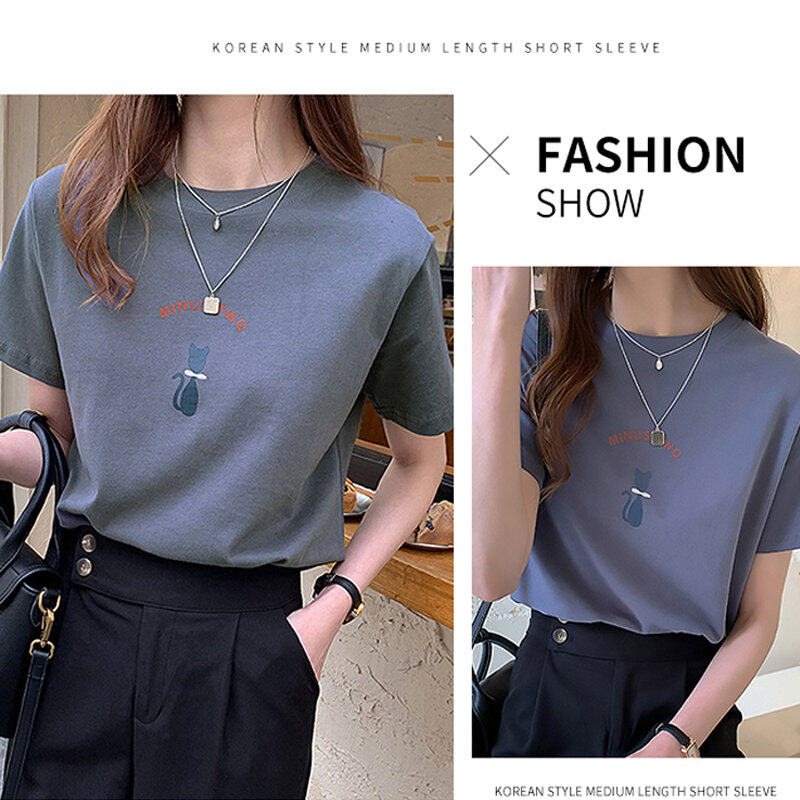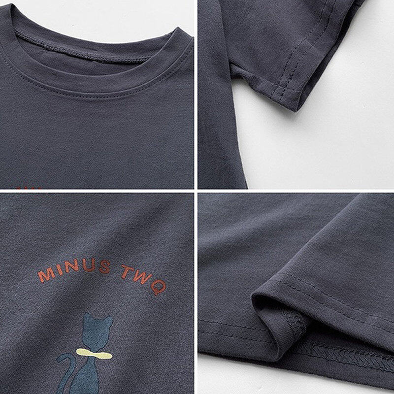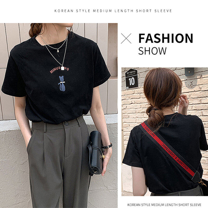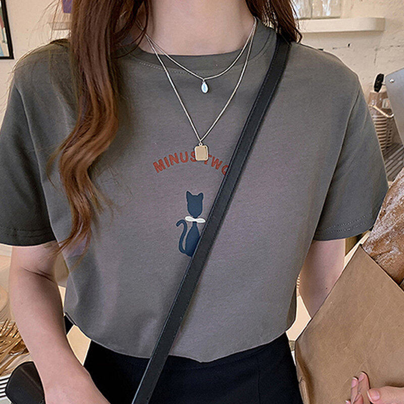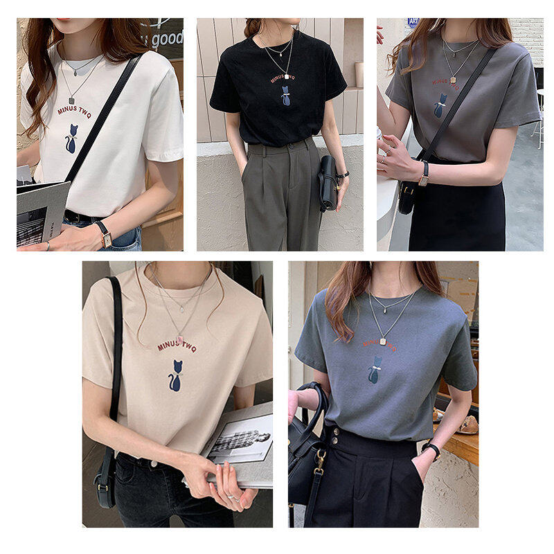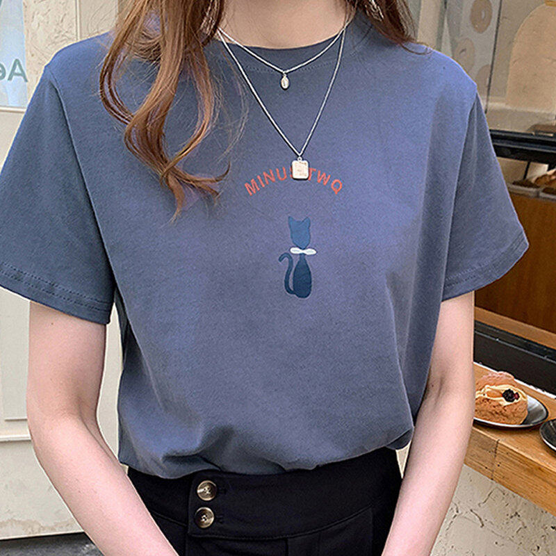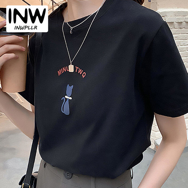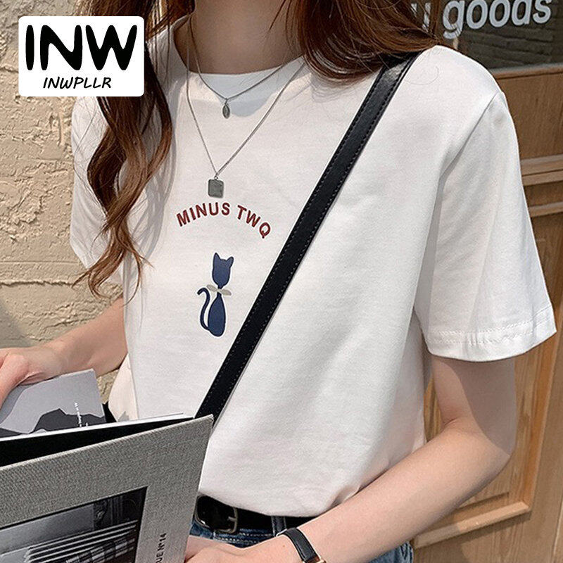 INWPLLR Women Tops Cute Cat Print Tshirt Summer Wear Women T-shirts Korea Letter T-shirt Women's Fashion Short Sleeve Tshits