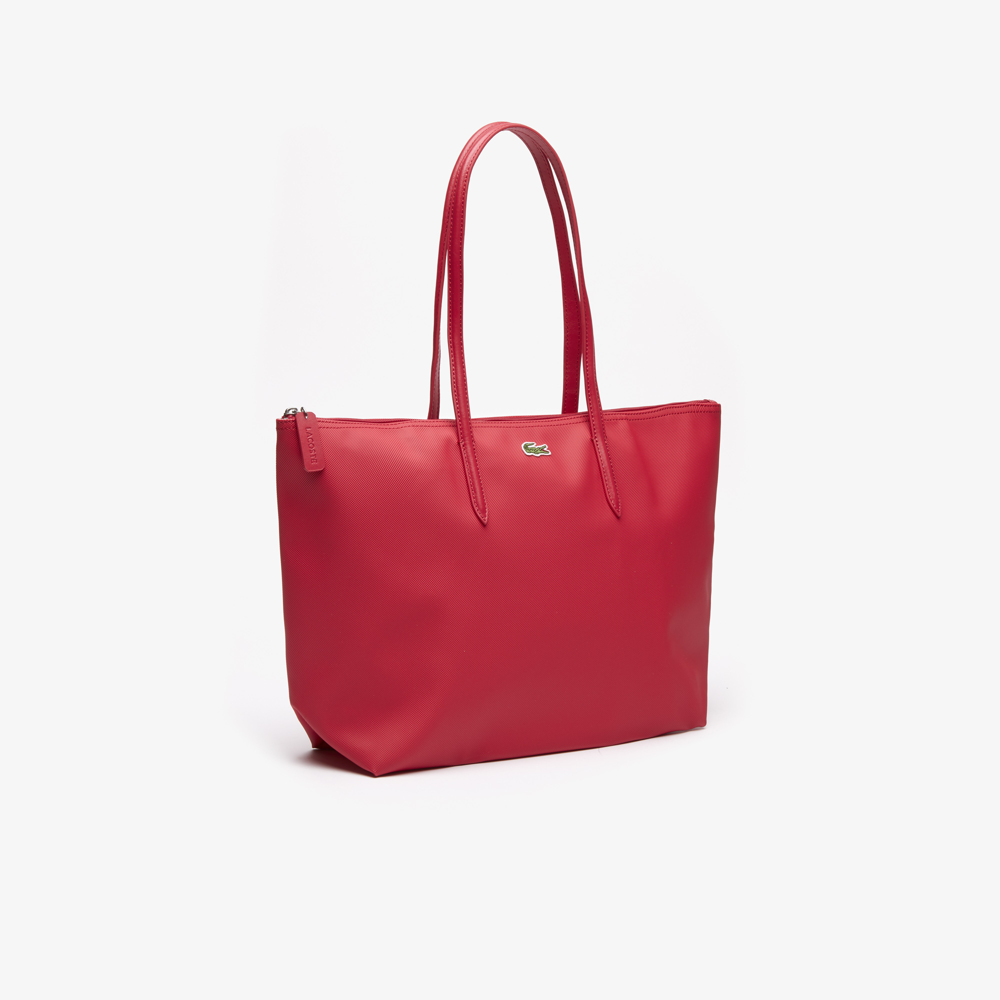 One interior Zippered net pocket with hook, Lacoste branded zipper slider, Embroidered green Crocodile branding, Dimensions 35 x 30 x 14 cm