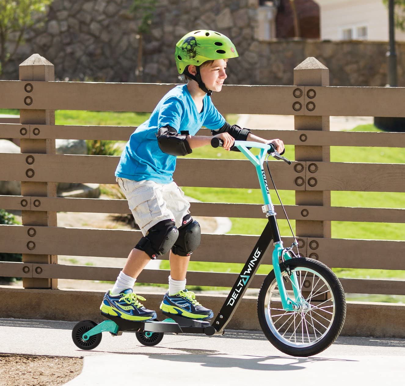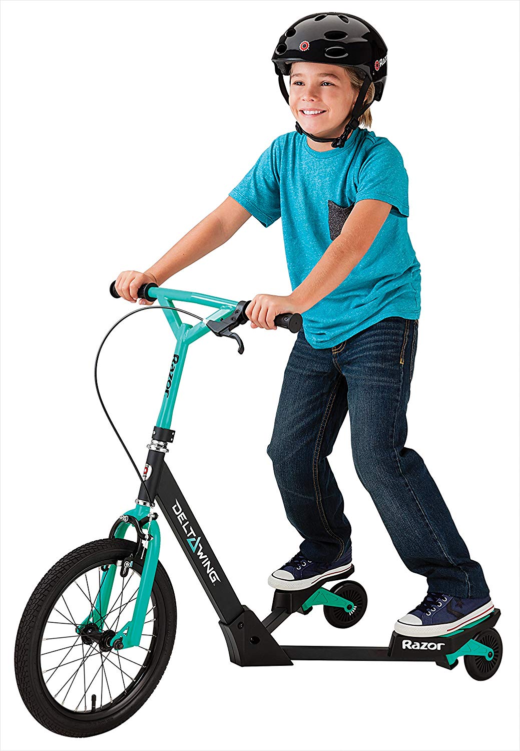 Cleared for Take Off. The all-new Delta Wing steps up to the next level of three-wheel action. Its drop frame, large pneumatic front tire and low-angle rear casters make the self-propelled Delta Wing a powerful yet smooth side-to-side ride, to shred sidewalks and carve up the pavement in style. The Razor Delta wing features a steel frame with high-tech polymer wings, 2 piece "Y" drop handlebar, soft rubber grips, front, hand-operated brake, large 16" (406 mm) pneumatic front wheel, and rear wheels feature low angle trailing casters with large 125 mm wheels for drifting and spinning. Recommended for ages 6 and older and will support a rider up to 143 pounds. The radical new way to ride. Wing it, drift it, spin like crazy. Standing or sitting, these awesome three-wheel machines produce a crazy ride style that's easy to learn. You'll be freestyling in no time. Rip it up with a Razor ride-on. Read and understand the enclosed owner's manual before riding. The buyer and rider of all Razor scooters are responsible for knowing and obeying all local, state and federal regulations regarding the riding and use of scooters.