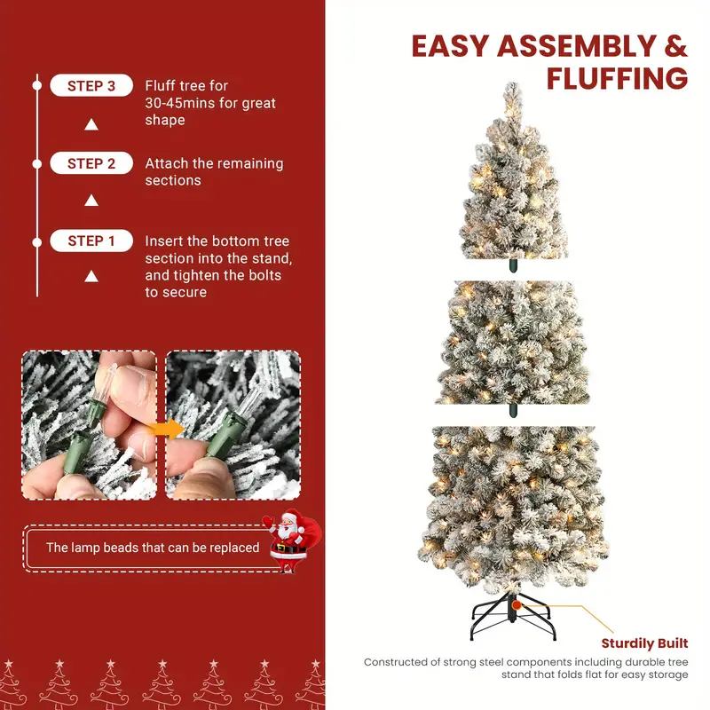 Flocked Artificial Christmas Tree with Warm White Lights, Full Branch Tips, Hinged Design for Easy Setup - Perfect for Holiday Decor, 6.5FT, Green